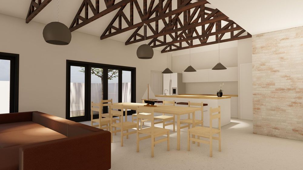 This modern residence is defined by its elegant touches and thoughtful design, emphasizing space and light throughout. The double volume ceilings adorned with exposed wooden trusses and striking exposed brick feature walls add architectural flair to this remarkable home.