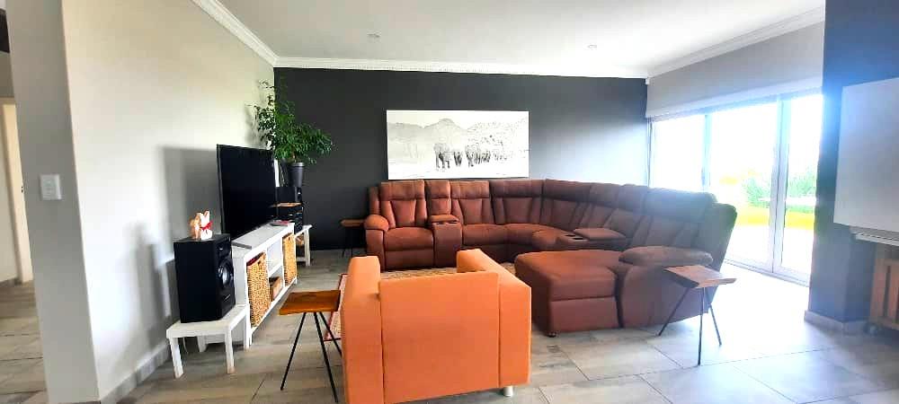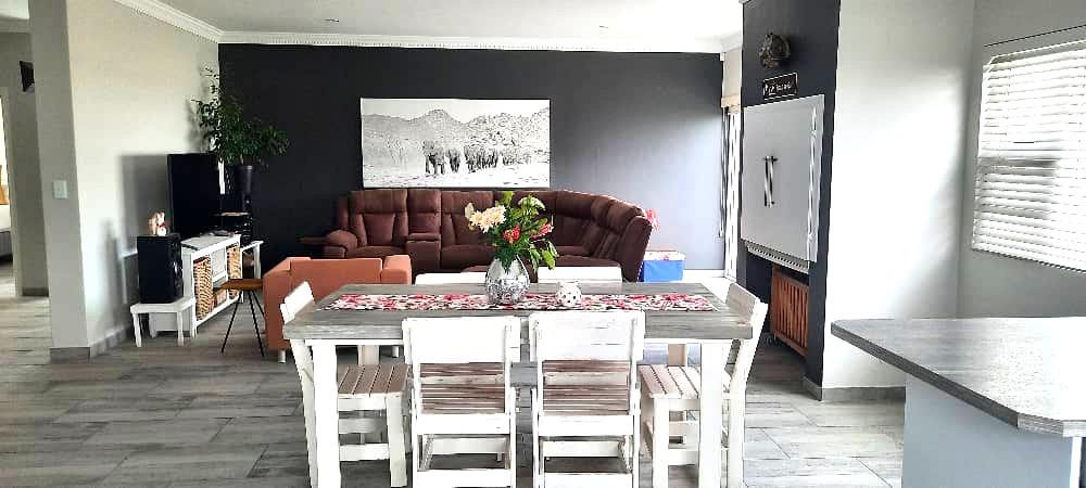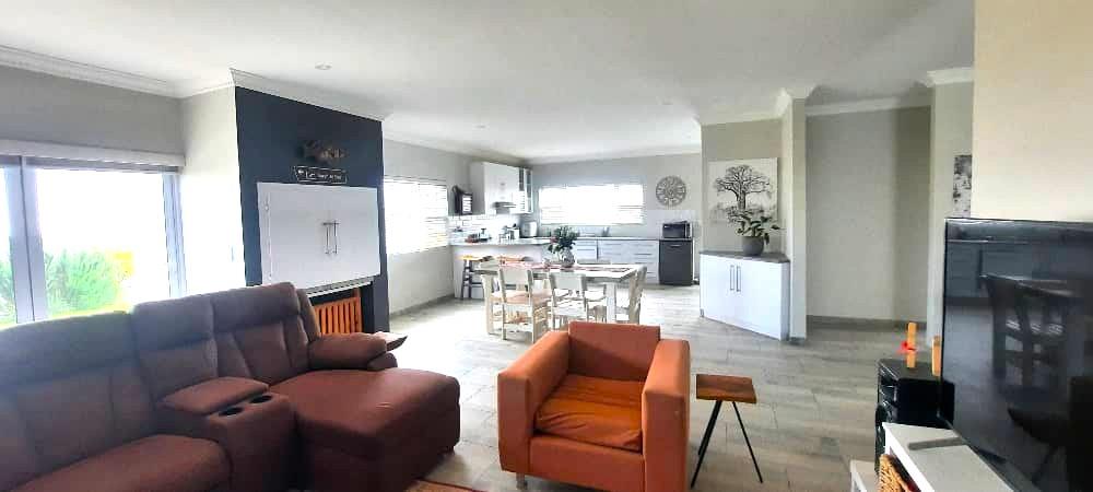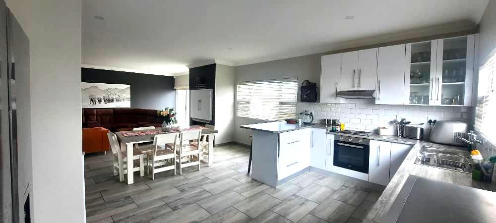 Step inside to discover an open-plan layout that seamlessly combines the kitchen, living, and dining areas. This spacious arrangement is perfect for entertaining guests or enjoying family time, with the added luxury of an indoor braai for those cozy gatherings. The contemporary kitchen is equipped with top-of-the-line finishes, ensuring a delightful cooking experience.