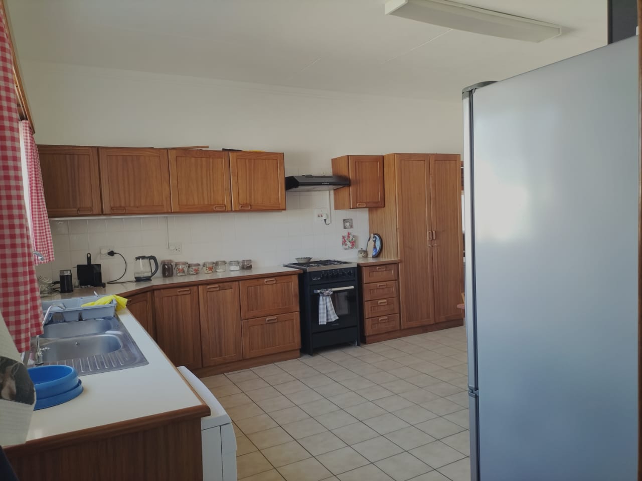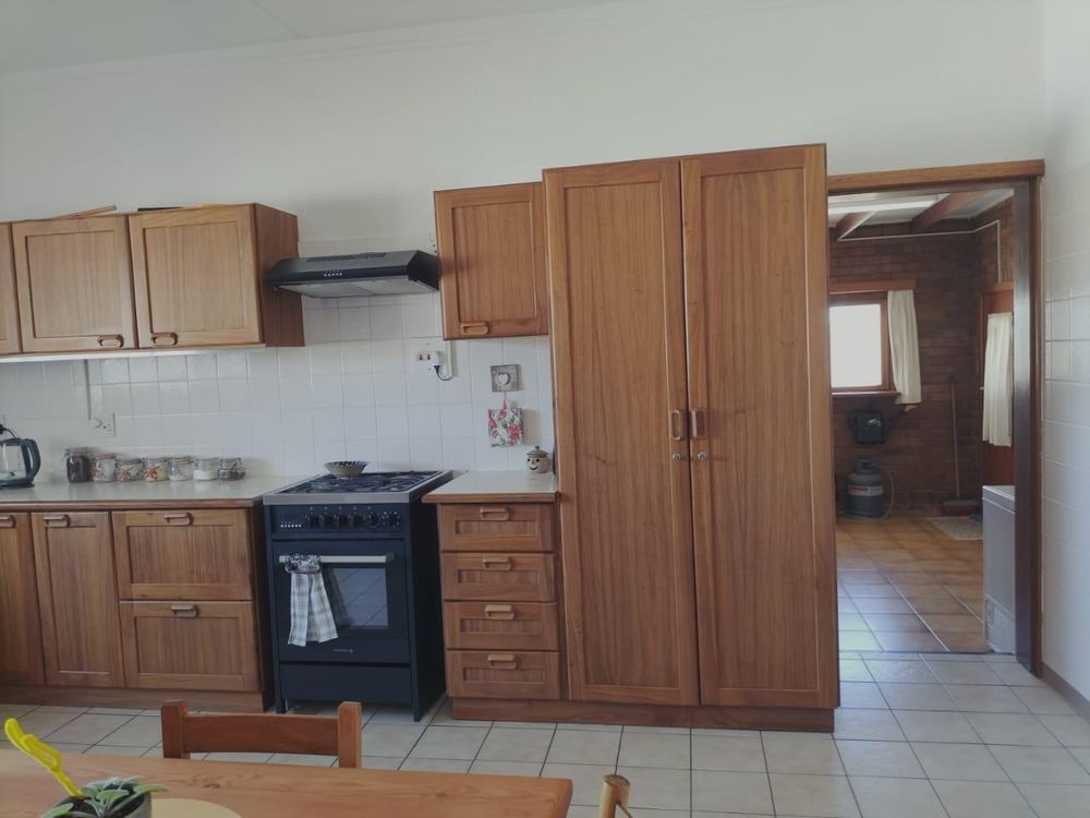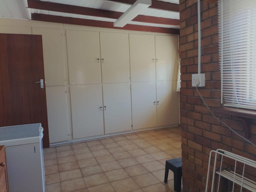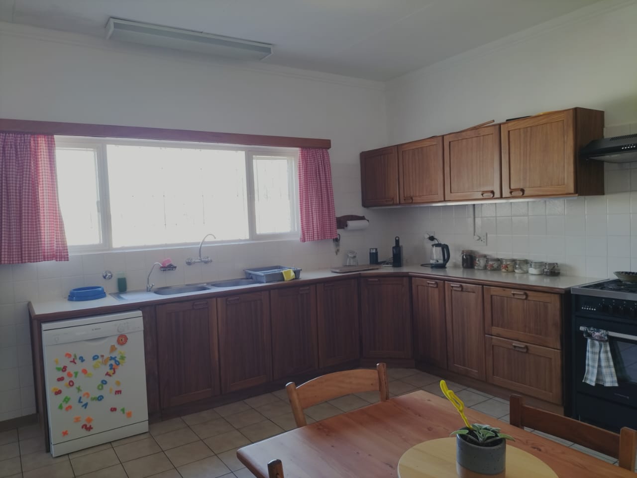 Step inside to discover spacious living areas, including a cozy living room equipped with a fireplace, air conditioning, and a ceiling fan, ensuring your comfort throughout the seasons. The heart of this home is its expansive kitchen, a baker's dream, featuring beautiful Kiaat wood cabinets and ample space for all your culinary adventures. A separate laundry room is thoughtfully included to meet all your laundry needs.