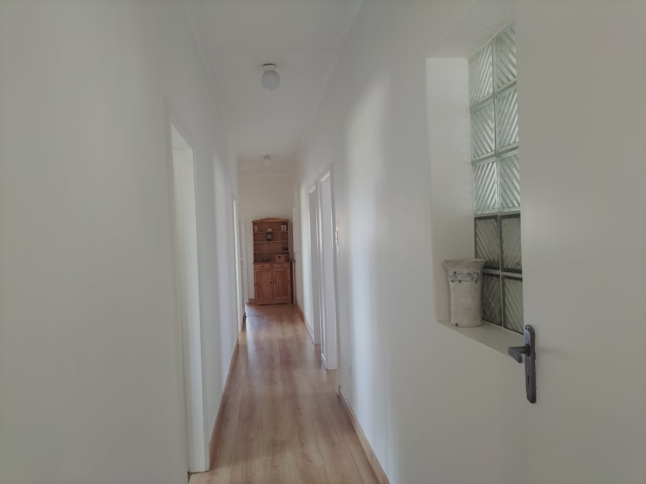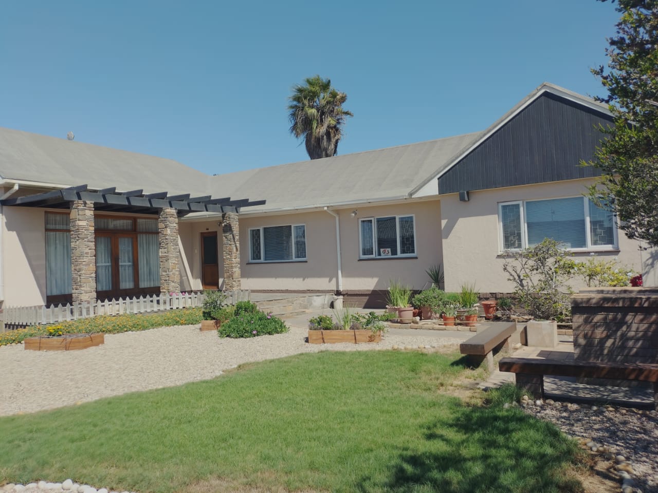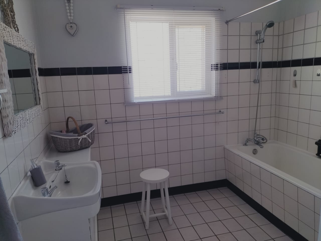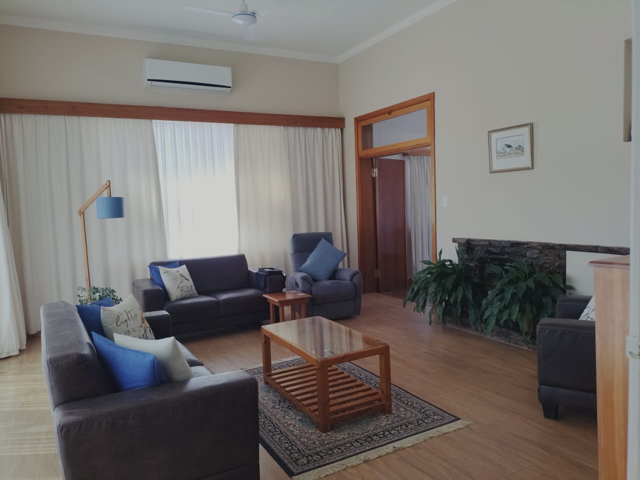 Step inside to discover spacious living areas, including a cozy living room equipped with a fireplace, air conditioning, and a ceiling fan, ensuring your comfort throughout the seasons. The heart of this home is its expansive kitchen, a baker's dream, featuring beautiful Kiaat wood cabinets and ample space for all your culinary adventures. A separate laundry room is thoughtfully included to meet all your laundry needs.
