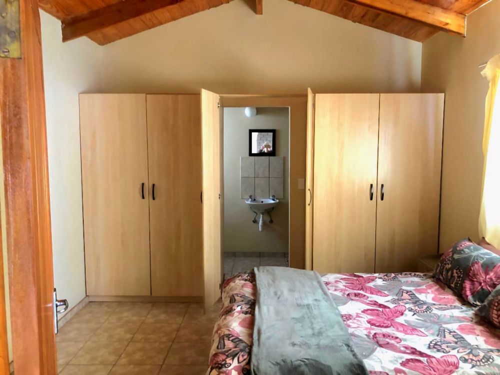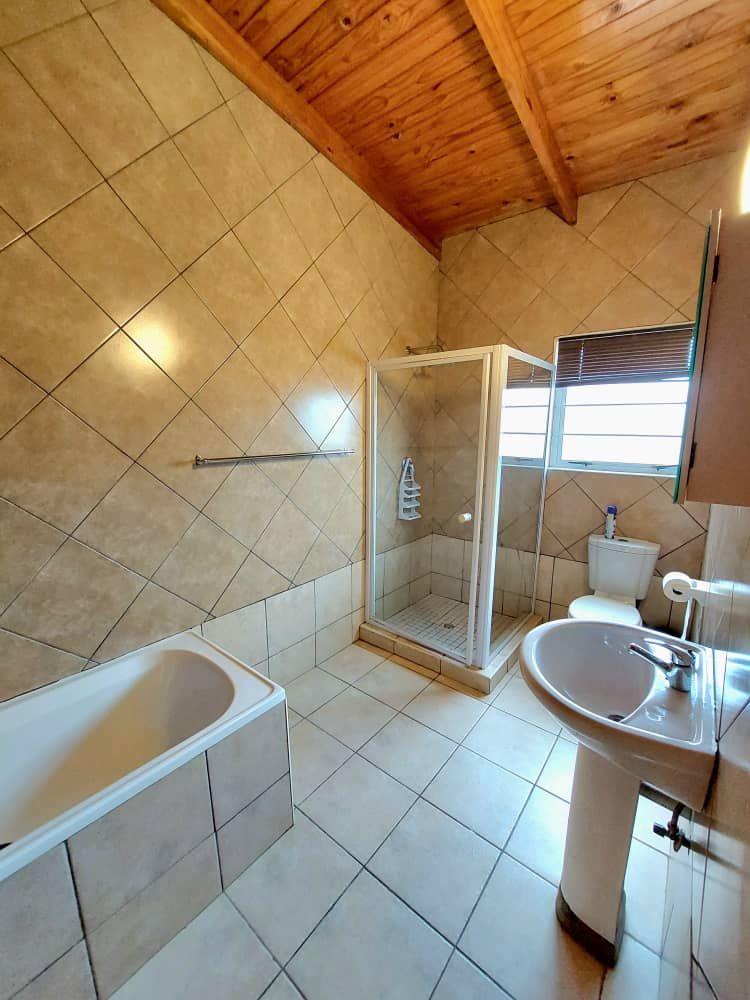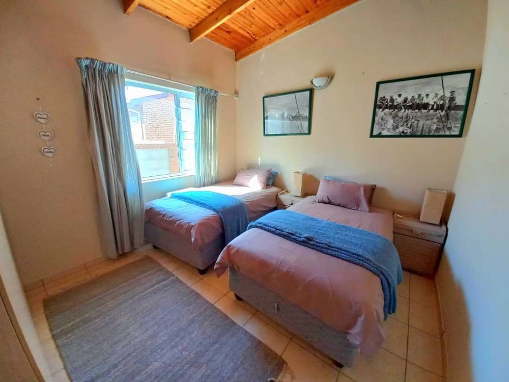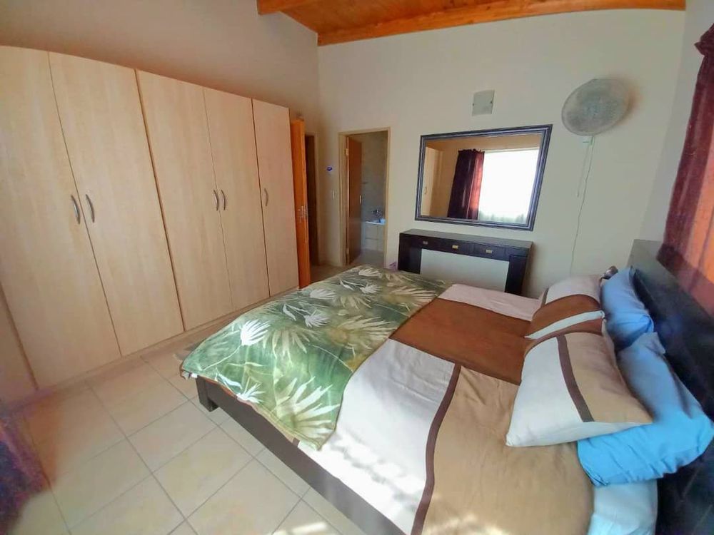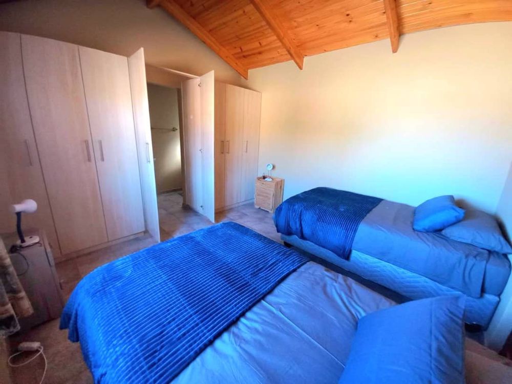 The main house 172m2 exudes a warm and inviting atmosphere. It features an open-plan living room and kitchen area with an indoor braai, adding to its cozy charm. The adjoining dining and braai area boasts a large 2nd indoor braai, perfect for hosting family gatherings. This space seamlessly extends onto an enclosed courtyard with high walls, providing additional room for entertaining. The house includes three comfortable bedrooms and two well-appointed bathrooms, ensuring ample space for everyone. Additionally, the property is equipped with a separate alarm system and a double garage for your convenience.